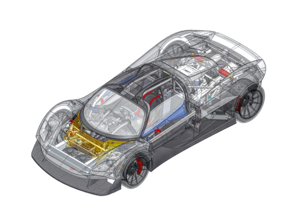 The chassis features a bespoke carbon fiber monocoque with lightweight aluminum-alloy tubular subframes. In contrast to “fashionable” composite subframes, the designer deliberately chose a tubular approach to improve access to the drivetrain components while effortlessly facilitating heat extraction and celebrating the mechanical aesthetic.